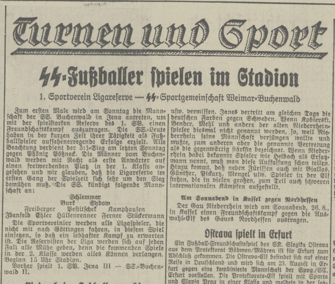 The Buchenwald SS football team was first mentioned in the sports sections of local newspapers in early 1939. Very little is known about it today. The SS footballers competed against clubs from the region in friendly matches and tournaments. Their opponents included SC Apolda, SV Kahla, Phönix Pößneck, Vimaria Weimar and the team from the Luftwaffen-Sportverein Weimar.